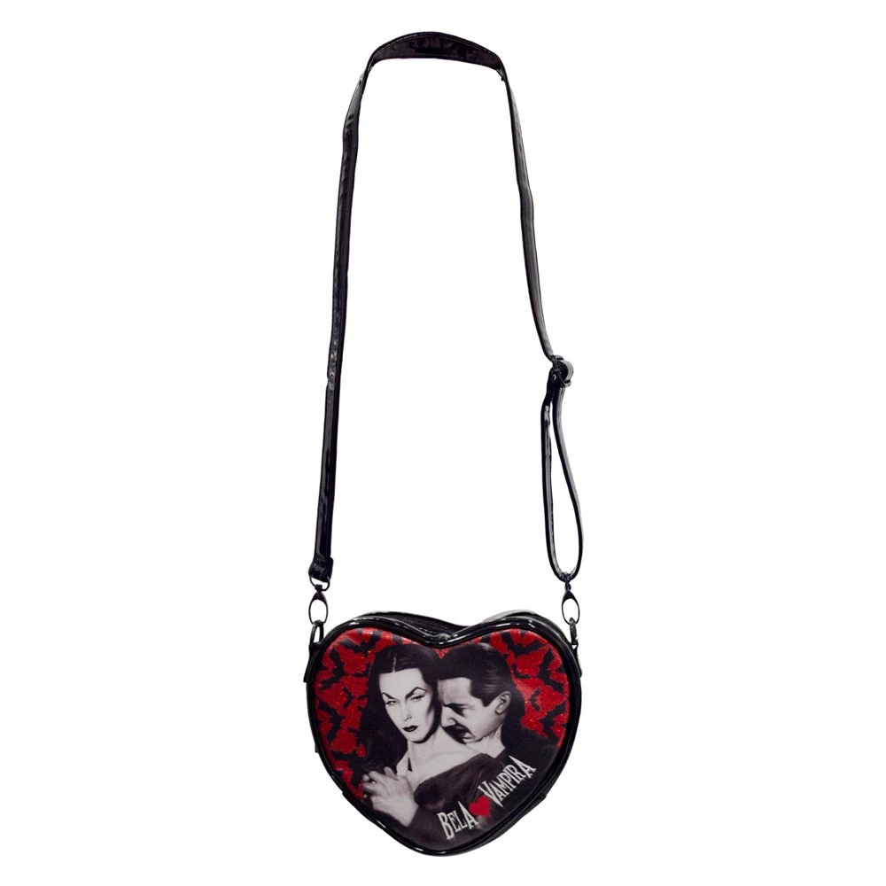 Officially licensed Bela Loves Vampira Mini Heart Purse from our Bela love Vampira line. Wear it any way you want! Comes with removable wrist and shoulder strap, so you can use it has a wristlet, shoulder bag or crossbody. made from Shiny PU bag measures 6.75″ tall, 7.5″ wide and 2.75″ deepÂ