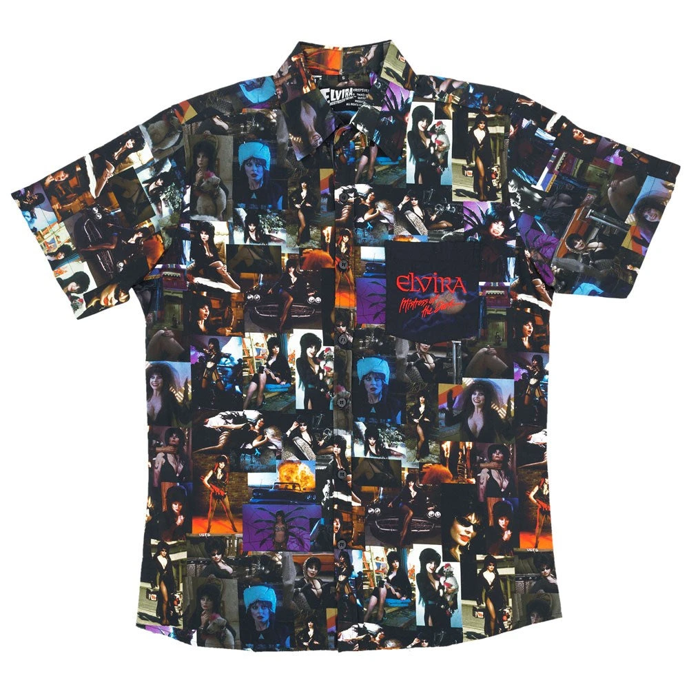 Official Elvira Mistress of the Dark men’s all over print button down shirt. Sublimated soft feel shirt featuring all over images from Elvira Mistress of the Dark movie, feature Elvira embroidered logo on pocket. 100% cotton shirt.