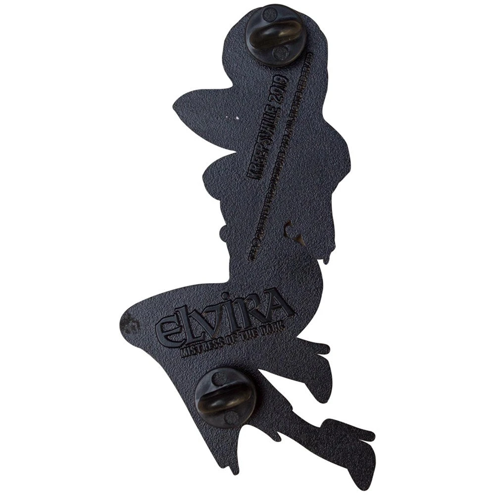 Special release official Elvira Mistress of the Dark enamel pin. XL size pin 3.5″ (9cm) high. With poison purple glitter dress and glitter shoe detail.