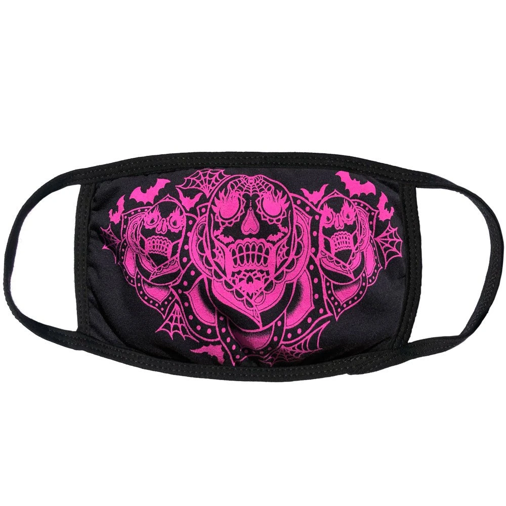 Kreepsville Dia De Los Muertos fabric face covering, these non-medical face coverings are double layered cotton fabric, washable and re-useable. Cotton bands with stretch that fit comfortably over the ears. Mask measures approx 7.5″ (19.5cm) X 5″ (13cm) Made by monsters in the USA!