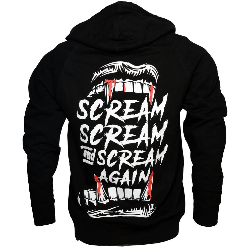 Kreepsville 666 Scream, Scream and Scream again unisex hoody, lightweight zip up hoody with Vamp teeth front logo and Scream backprint. Hoody 80% cotton, 20% polyester. Made in the USA by Kreepsville.