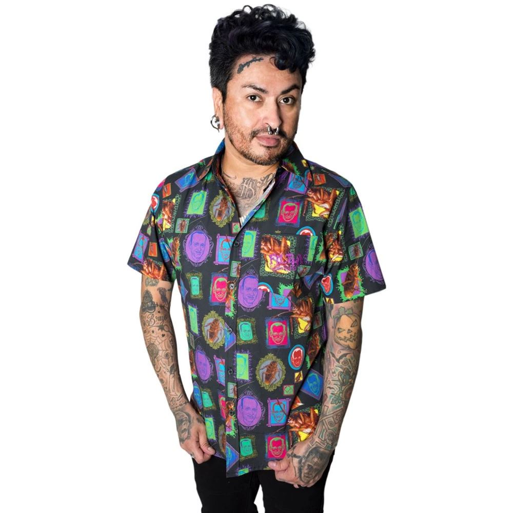 Official Filthy by John Waters Portraits Shirt men’s all over print button down shirt. All over sublimated soft feel shirt featuring all over art portraits of John Waters and of course…. roaches. Pink embroidered John Waters logo on pocket. 100% cotton shirt.