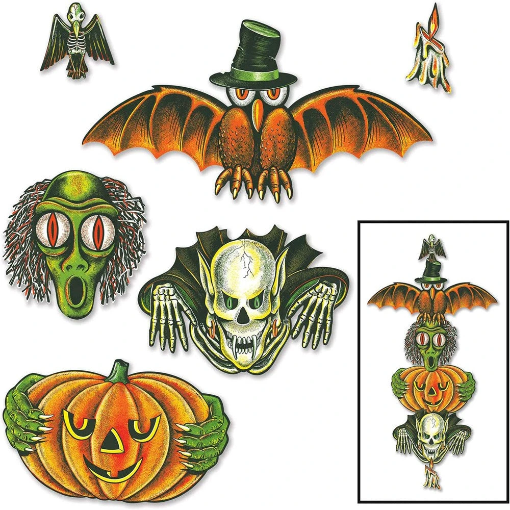 Vintage Halloween totem pole cutouts set by Beistle. size: 6 inches-28 inches