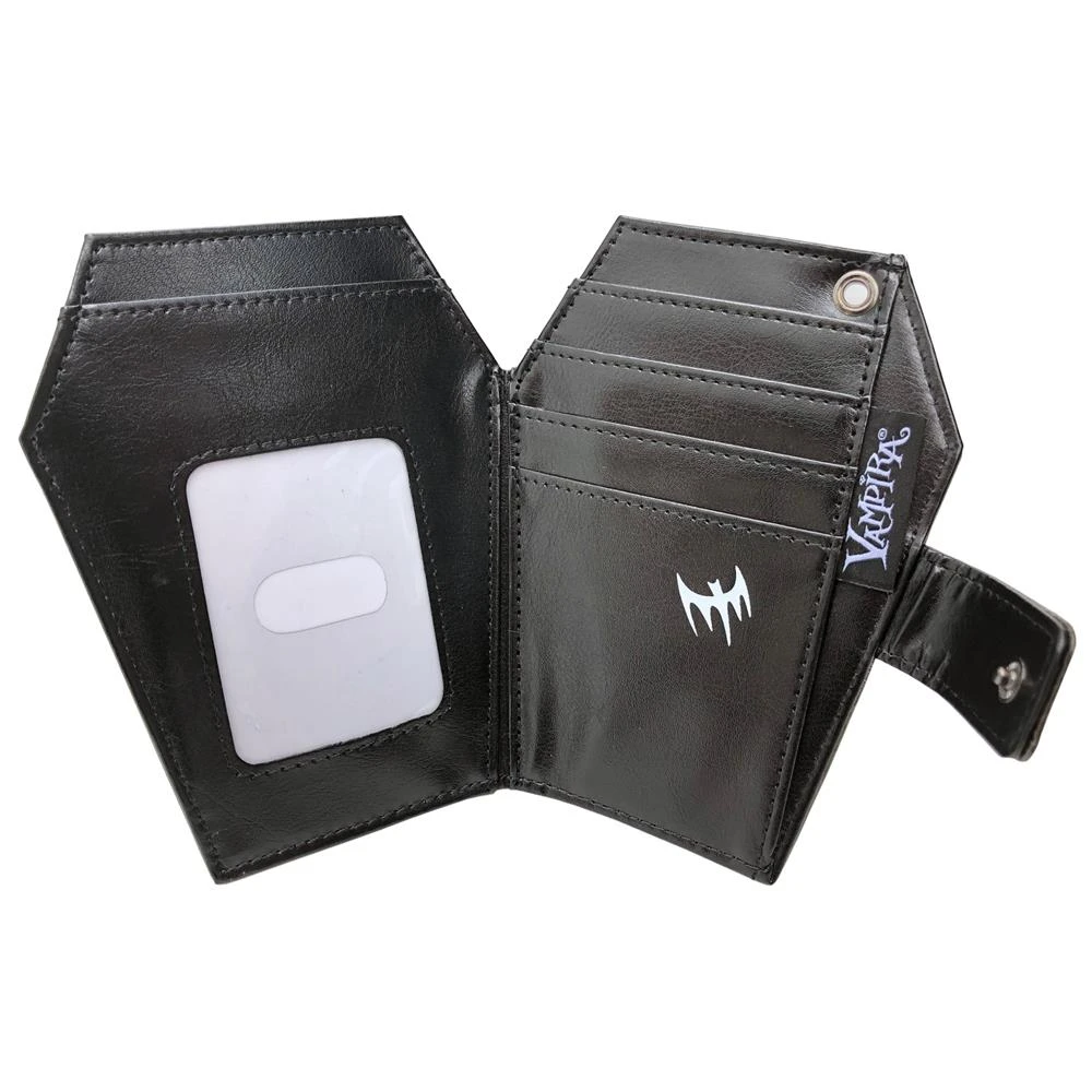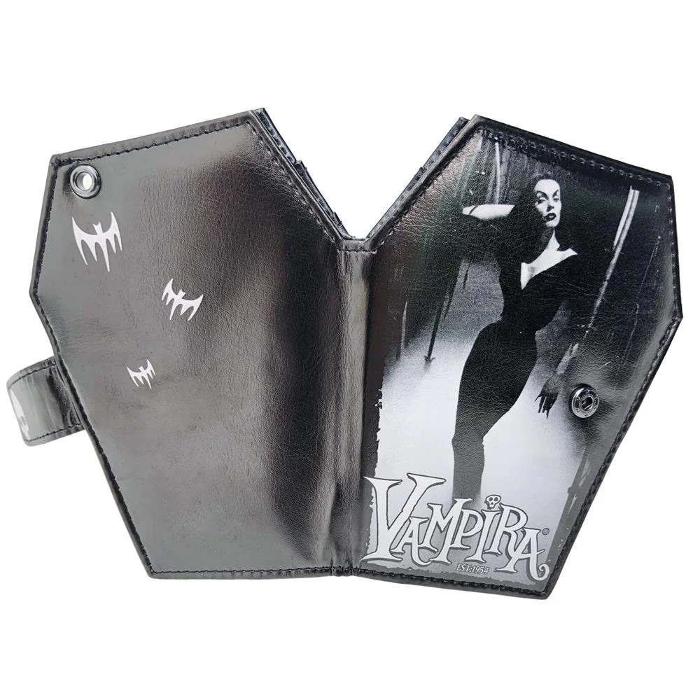 Looking for a gothic wallet that’s as dark and mysterious as you are? Check out the officially licensed Vampira Mist Coffin Wallet from Kreepsville! This wallet is printed with a hauntingly beautiful image of Vampira, and comes complete with a snap fastener, ID and card sections, and an eyelet for attaching a wallet chain. Made from durable PU, the Vampira Mist Coffin Wallet is sure to make a hauntingly stylish statement. Size when closed approx 5.5″ L (14cm) x 4.25″ W (11cm).
