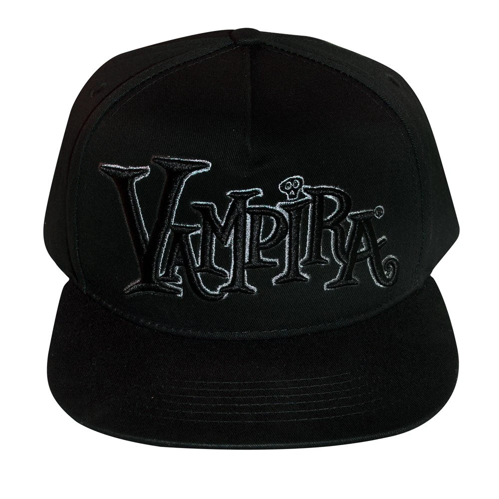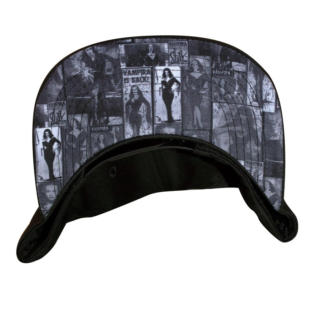Officially licensed Vampira Baseball Hat, featuring Vampira embroidered in black outlined in grey on the front and a sublimation vampira print on the underside of the brim.Â